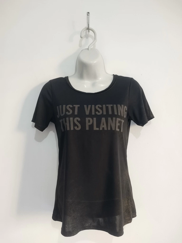 T-shirt estilosa com gola redonda, manga curta e estampa escrita na frente. O brilho dourado adiciona um toque de destaque, enquanto a leve transparência garante um visual moderno e ousado. Usadoa, porém em excelente estado de conservação.